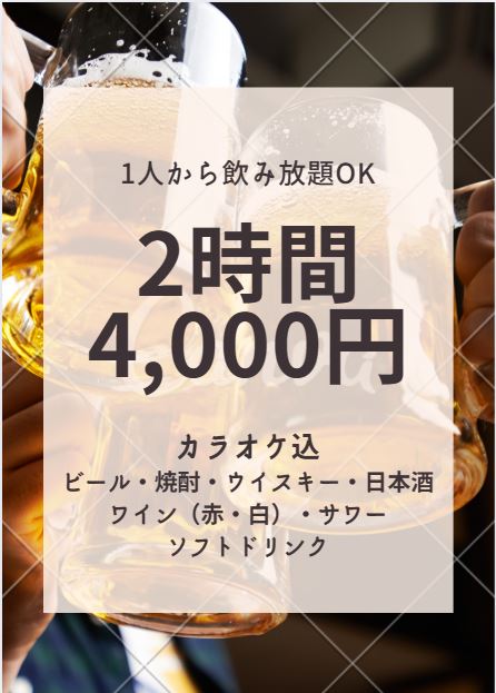 お1人様 2時間飲み放題 4,000円(カラオケ込み)